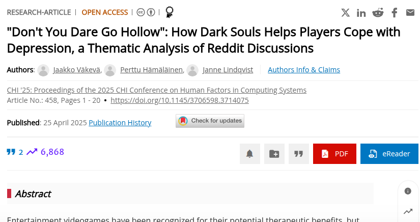 2025. ‘Don’t You Dare Go Hollow’: How Dark Souls Helps Players Cope with Depression, a Thematic Analysis of Reddit Discussions. In Proceedings of the 2025 CHI Conference on Human Factors in Computing Systems (2025). , .