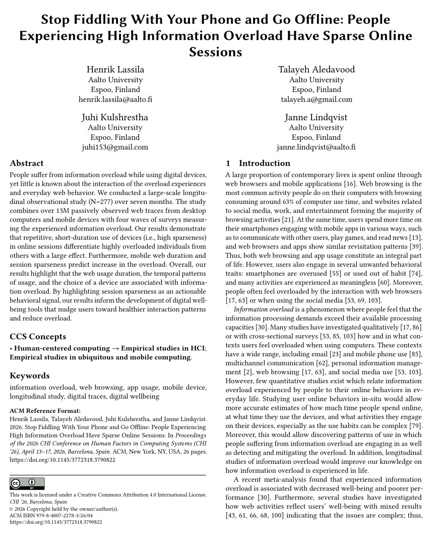 Henrik and Janne published “Stop Fiddling With Your Phone and Go Offline: People Experiencing High Information Overload Have Sparse Online Sessions”, a large scale observational study over seven months, investigating web traces and survey measures, showing avenues on how we can make better digital well-being tools that could nudge users towards healthier, less overload prone, interactions with technology.